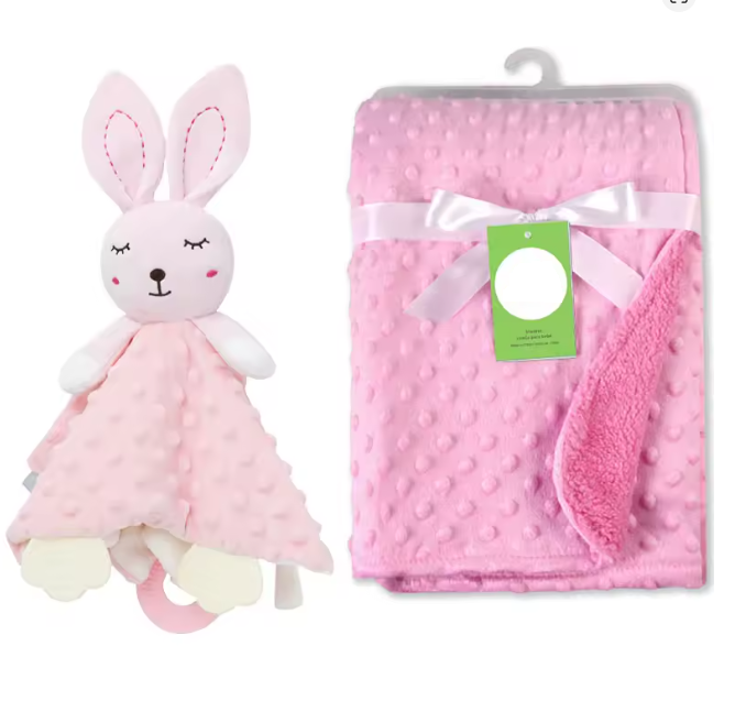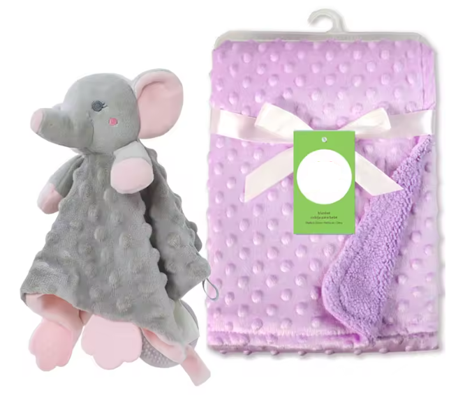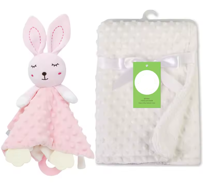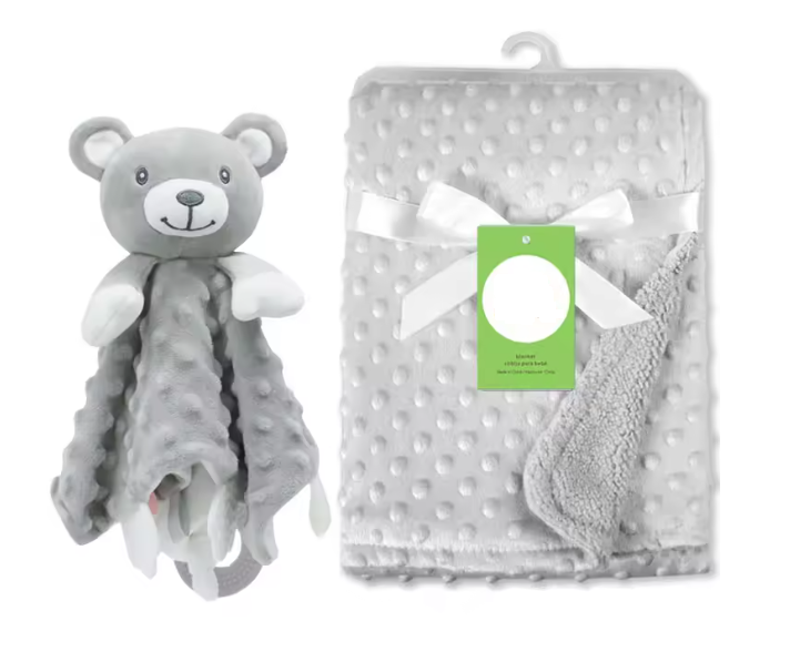 Miękki zestaw dla niemowląt – kocyk z pluszowej tkaniny i urocza przytulanka w kształcie zwierzaczka. Wykonany z bezpiecznych, delikatnych materiałów, idealny już od pierwszych dni życia. Doskonały do otulania, drzemek i codziennego przytulania. Sprawdzi się również jako prezent na baby shower lub pierwszą wyprawkę.